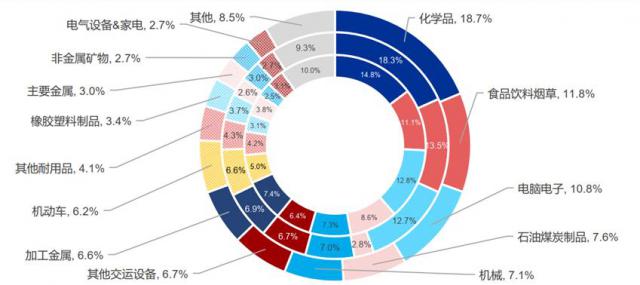 图:美国制造业增加值结构(内圈 2008,中圈 2020,外圈 2023) 资料来源:CEIC,申万宏源
