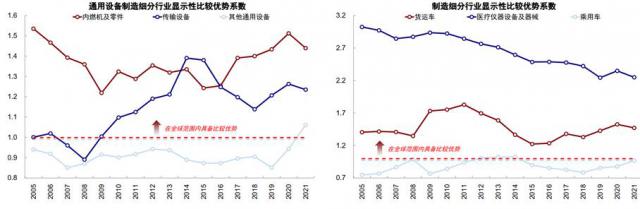 在制造业细分行业层面,美国在高技术含量制造品类如医疗器械、内燃机、货运车、航天上,仍然保持明显的产业优势,而且在制造业回流扶持政策出台之后,相对全球的比较优势系数,从接近被拉平到持续回升。