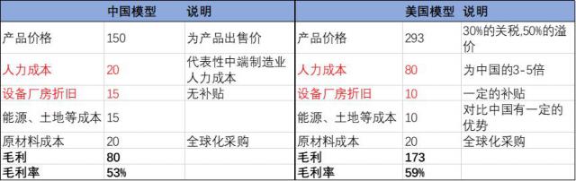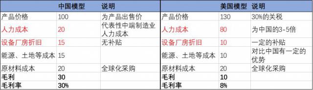 最后是产品在美国的售价,由于有关税的存在,假设最终企业拿到的价格,美国企业比中国高出 30%,其他成本项用上述条件,我们建立中端制造业的模型: