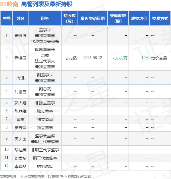 ST岭南的高管列表及最新持股情况如下: