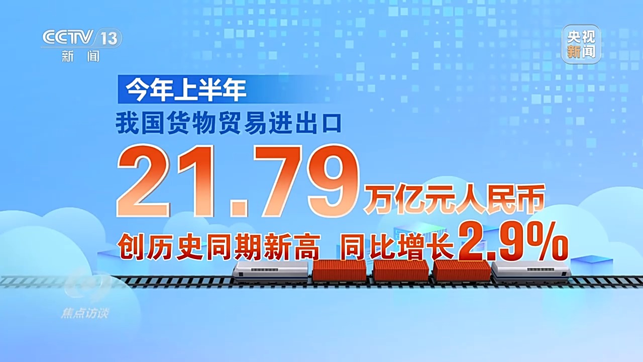 今年上半年,我国货物贸易进出口21.79万亿元人民币,创历史同期新高,同比增长2.9%。其中,出口增长7.2%,出口规模历史同期首次突破13万亿元。
