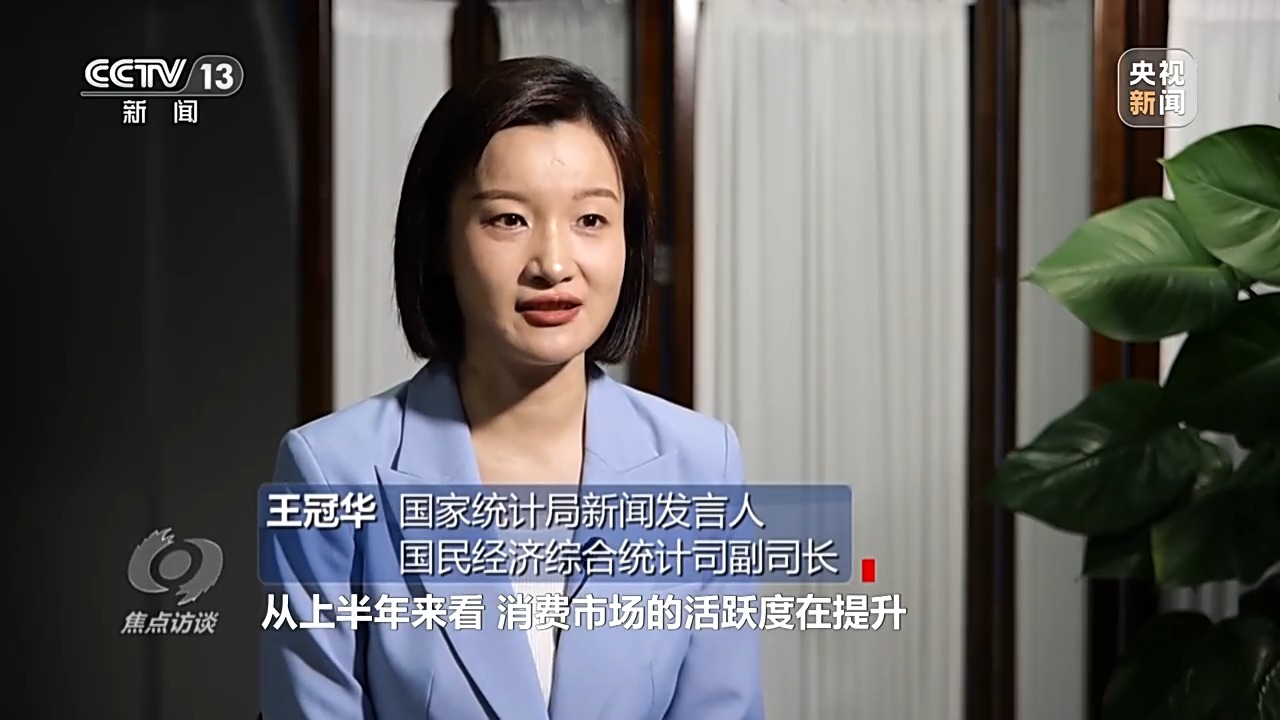 国家统计局新闻发言人、国民经济综合统计司副司长 王冠华:从上半年来看,消费市场的活跃度在提升,社会消费品零售总额增长了5.0%,比上年全年加快了1.5个百分点,二季度又比一季度有所加快。从对经济增长的贡献来看,内需对经济增长的贡献率接近七成,其中最终消费支出的贡献率超过了五成,这意味着我国的经济增长更多依靠内需,特别是消费拉动,这符合我们结构调整和经济高质量发展的要求,也有利于提升中国经济的内生动力和稳定性。