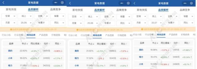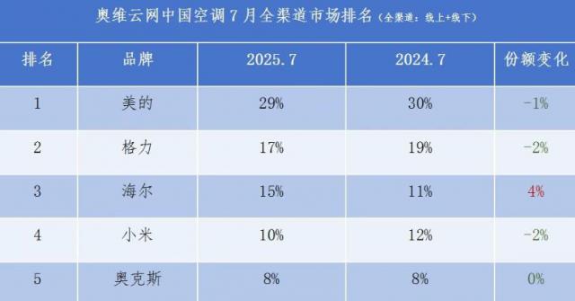 2025 年 1-7 月,奥维云网数据显示,空调线下市场份额格力稳居前二,甚至在 4 月超过美的成为第一,而小米七个月里排名均在十名开外。